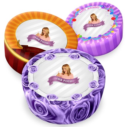 Erstellen Sie in nur wenigen Schritten ganz unkompliziert Ihre eigene runde Fototorte! Im 1. Schritt wählen Sie eins von den hier präsentierten Designs zu verschiedenen Anlässen.