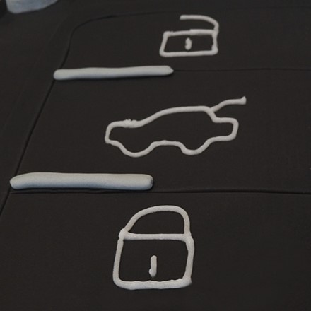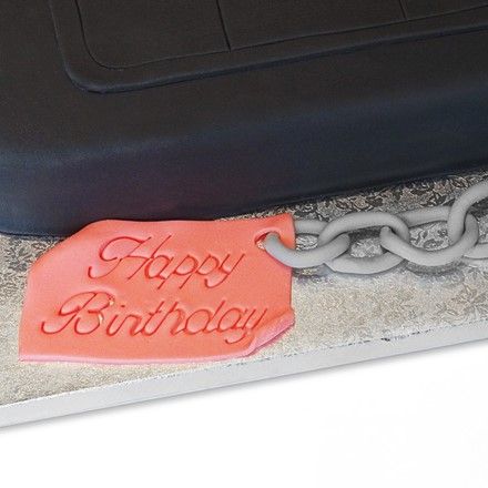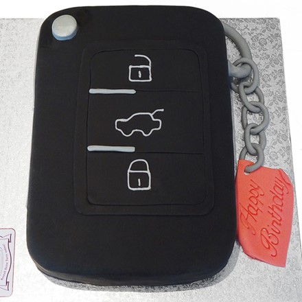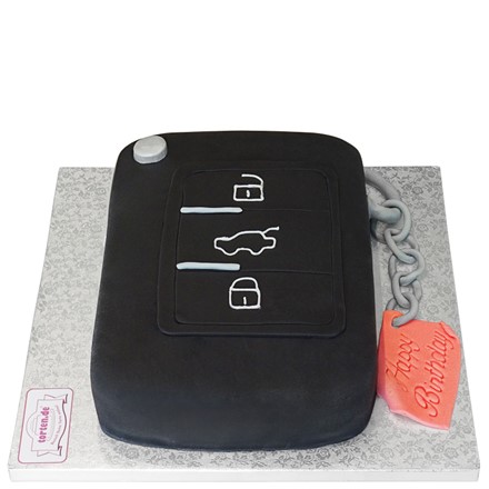 Ein toller Tipp zur erfolgreichen Führerschein-Prüfung: eine Torte als Autoschlüssel modelliert und dekoriert. Mit schwarzem Fondant ummantelt, wird sie mit den typischen Details dekoriert: Tasten, Icons, Knopf und Anhänger, auf dem "Happy Birthday" steht. Falls die Torte nicht zum Geburtstag gedacht ist, können wir diesen Text ändern und zum Beispiel einen Namen darauf schreiben. Ihren Wunschtext können Sie unter Zubehör eingeben.
