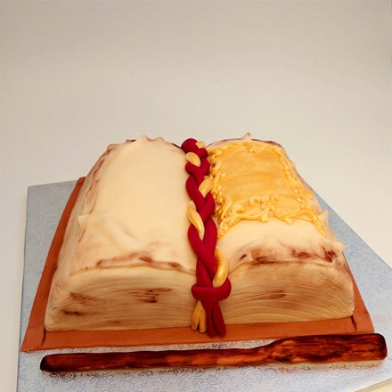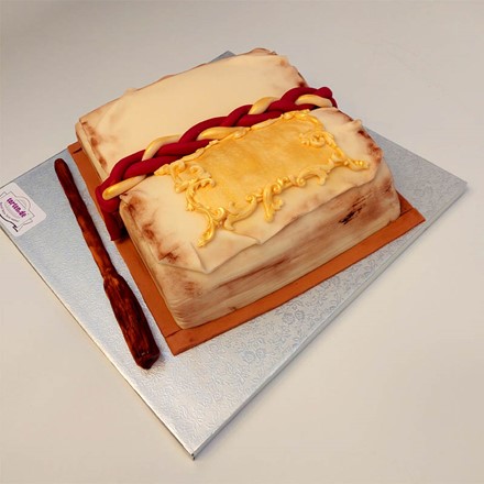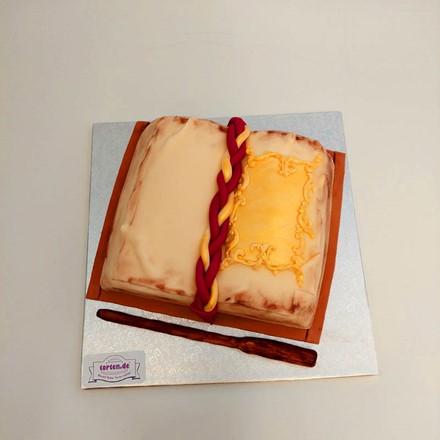 Fans von Fantasy und Zauberei, Hobbits, Drachen und Hexen kommen mit unserer Buch Torte voll auf ihre Kosten. Unsere Torte in Form eines alten Buchs wird mit einem Zauberstab und Buch-Kordel aus Fondant dekoriert. Eine kurze individuelle Widmung kann auf die Tortenplatte platziert werden. Zusäzlich kann die Torte mit individuell gefertigten Torten-Toppern und verschiedenen Kerzen dekoriert werden. Diese Zubehör-Artikel werden im Bestellvorgang angezeigt.