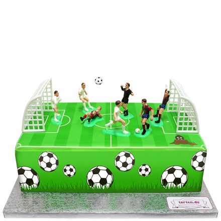 Über diese Fußballtorte werden sich nicht nur kleine Kicker, sondern auch Erwachsene Fans freuen. Auf dem satt-grünen Spielfeld stehen 2 Tore und Spieler (die Abbildung der Fußballtorten-Deko ist beispielhaft, die Anzahl und Ausführung der Figuren können sich variiren). Solche Fußballtorten können zu verschiedenen Anlässen bestellt werden.