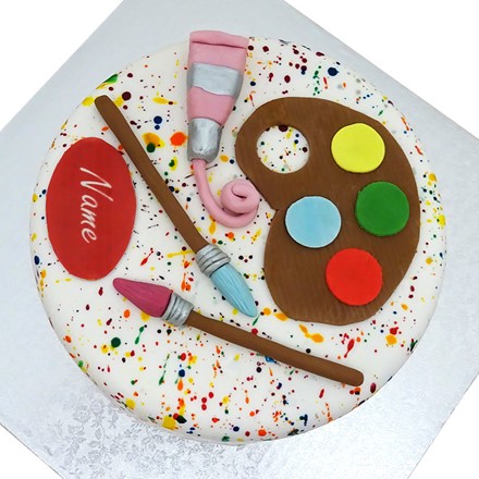 Für alle Künstler, ob Profis oder Amateure, haben wir dieses bunte Torte kreiert. Komplett in Handarbeit gefertigt, wird sie mit typischen Künstler Accessoires aus Fondant verziert. Individualisiert kann man unsere Kunsttorte mit einem Namen oder einer Zahl.