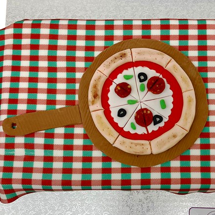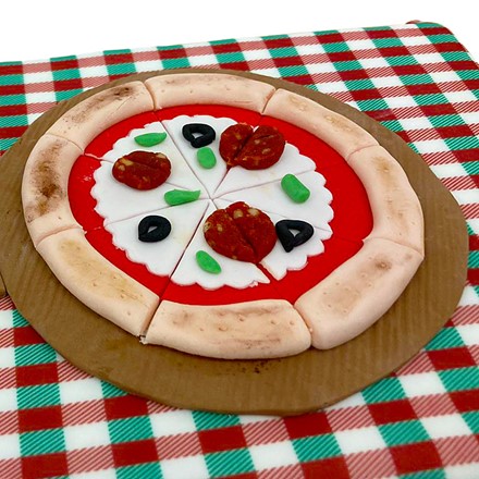 Für alle großen und kleinen Pizza-Fans und Italien-Verliebten haben wir diese Torte ausgedacht. Eine rechteckige Torte wird als Tisch in einer gemütlichen italienischen Trattoria eingedeckt. Auf dem Tisch wartet schon eine Pizza aus dem Holzofen auf einem typischen Holzbrett serviert - selbstverständlich eine süße Kreation aus Fondant und Marzipan. Die Botschaft auf dem Schild kann individualisiert werden, s. Zubehör - Text für die Torte.