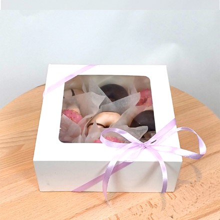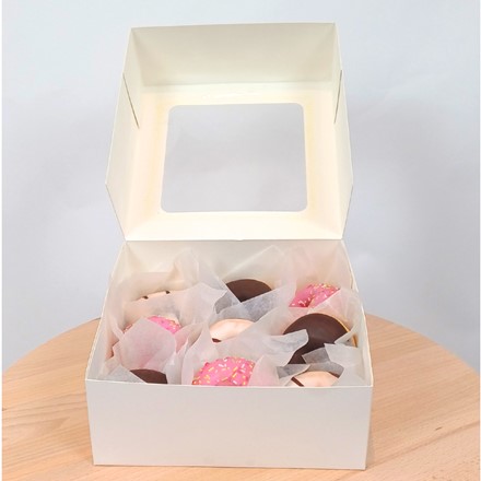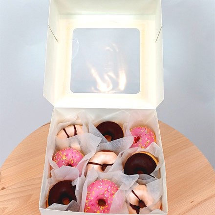 Ein tolles kleines Geschenk oder Aufmerksamkeit zu vielen Anlässen! 9 leckere Mini-Donuts (in unterschiedlichen Geschmacksrichtungen nach Vorrat) werden in eine Schachtel mit Sichtfenster eingepackt und mit Satinband dekoriert. Diese Geschenkbox wird in einem Umkarton versendet. Eine hübsche Karte kann dazu bestellt werden. Deinen Wunschtext kannst du in das entsprechende Textfeld eintragen.