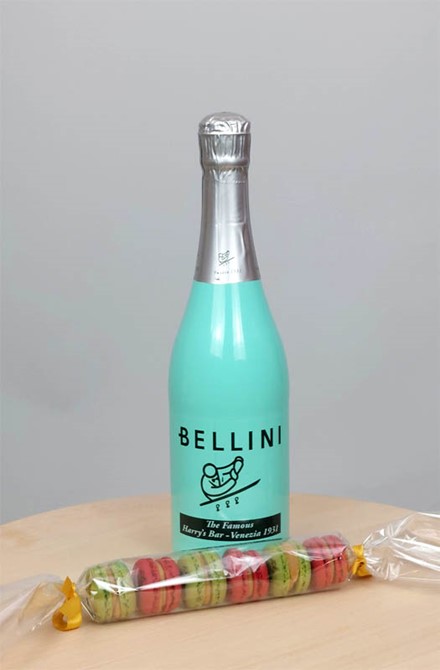 Bellini: Weinhaltiger Cocktail mit weißem Pfirsich. Enthält Sulfite. Vegan. Macarons: Zuckerpulver, Mandelpulver, Zucker, Eiklarpulver, Kokos-Pflanzenfett, Emulgatoren: E471, E472b, E477, E481 (Milch), Stabilisator:E415, Salz, Farbstoffe: E120, E160a, Antioxidationsmittel: E300. Caramel-Creme: Invertzuckersirup, Zucker, Karamell, Wasser, Glukosesirup, Propylenglycol, Rapsöl, Palmfett, MAGERMILCHPULVER, Emulgator Sonnenblumenlecithin, Natürliches Aroma.