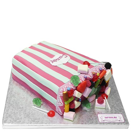 Das ist mal eine Überraschungstüte - so schlau haben wir diese Torte für euch verpackt. Die Torten-Tüte oder die Tütentorte ist der eigentliche Kuchen - total süß mit Fondant-Streifen und essbarer Spitze dekoriert. Und oben drauf kriegt ihr noch die bekannten und beliebten Süßigkeiten, zum Beispiel von Haribo, etc.
