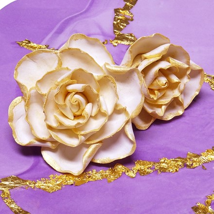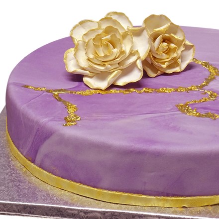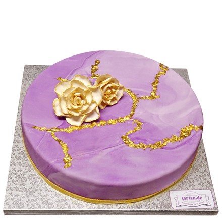 "Von einem goldenen Teller essen..." war gestern, zumal man von einem schönen Teller alleine nicht satt wird, auch wenn das Auge mit isst. Unsere elegante lila marmorierte Torte wird mit echtem Blattgold dekoriert, das man einfach mit essen kann. Essbares Blattgold wird als dünne Folie aus reinem Gold definiert. Es hat keinen Geschmack und kein Aroma und kann somit den süßen Geschmack der Torte nicht verfälschen.