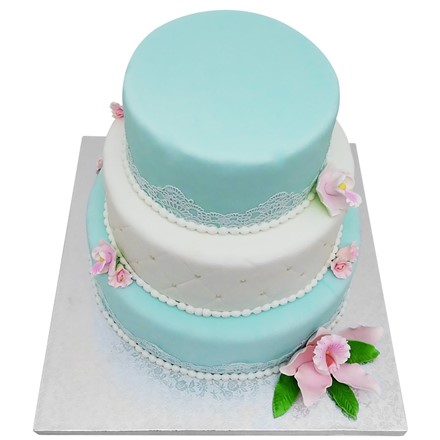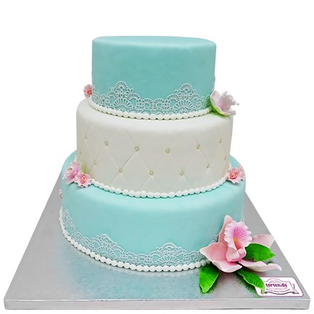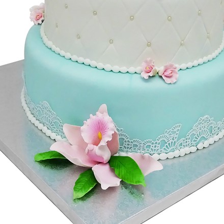 Diese dreistöckige zeitlose Torte passt wunderbar zu einer Hochzeit. Zarte essbare Spitze, das unaufdringliche Raute-Muster mit Perlmutt-Zuckerperlen bestückt und die Pastelltöne, sowie die Orchideen-Blüten machen diese Hochzeitstorte universell.