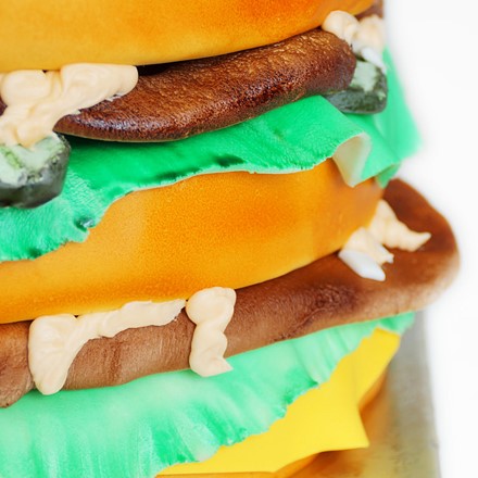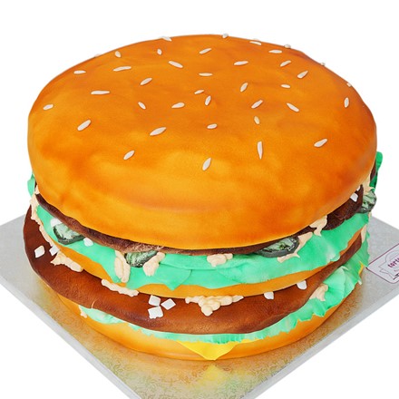 Für Fans der XXL-Restaurants oder einfach für alle, die eine Riesen-Torte für eine große Feier brauchen, haben wir diesen Doppelten-Burger als Torte kreiert. Der Riese wird aus zwei Kuchen mit ca. 30 cm Durchmesser zusammengebaut. Die Kuchen werden wie gewohnt mit Creme deiner Wahl gefüllt. Das Fleisch-Patty, Käse, Gurkenscheiben und Salatblätter sind aus Fondant - handmodelliert und -strukturiert. Als Burger-Sauce zwischen den Etagen fungiert wieder die Cremefüllung.