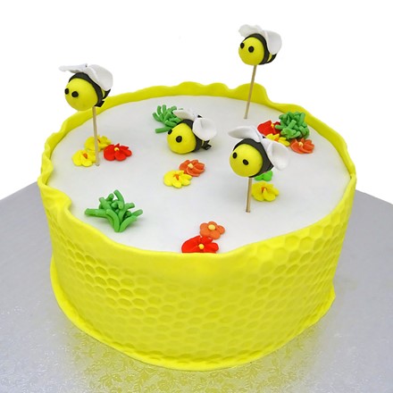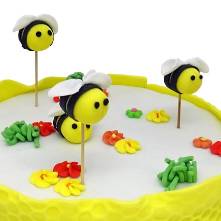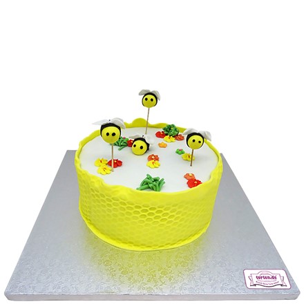 Das summende Bienenvolk hat sich auf der Blumenwiese versammelt und wartet darauf gefeiert zu werden. Unsere bunte Bienentorte macht Stimmung und sorgt für Spaß auf der Kindergeburtstagsparty! Wenn das Motto Biene lautet, dann sollte alles dazu passen, auch die Torte. Die Motivtorte Biene wird handgefertigt, die handgemachten Bienen-Zuckerfiguren werden separat eingepackt und dürfen vor dem Servieren in die Torte gesteckt werden. Der Tortenrand wird mit knallgelbem Bienenwaben aus Fondant dekoriert.