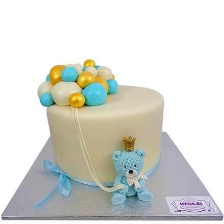 Unsere trendige Torte mit Teddy und Luftballons ist besonders bei den Eltern und Großeltern kleiner Kinder und Babys beliebt. Das süße handgemachte Bärchen hält viele Luftballons, ebenfalls handgefertigt. Die vielen liebevollen Details und Dekorationen machen diese Luftballons Torte zu einer idealen Babytorte. Wenn unsere Torte mit Luftballons zur Geburt oder Taufe bestellt wird, können wir ein Datum und einen Namen auf die Torte schreiben. Diese Angaben macht ihr im Bestellvorgang unter Zubehör.