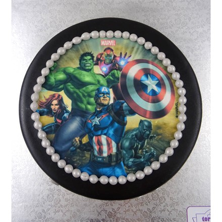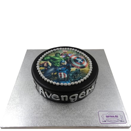 Klein und groß sind von den Marvels Avengers Comicfiguren fasziniert. Daher ist unsere Avengers Torte eine tolle Idee für eine Geburtstagsparty in dem Comic-Stil. Der Lizenz-Aufleger ist essbar und besticht durch gestochen scharfe Druckqualität. Die passenden Dekorationen werden handgefertigt. Die stilvolle Torte mit schwarzem Fondant ist komplett essbar. (Aufleger lizensiert über Jacobi Decor.)