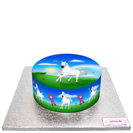 Welch eine kleine Prinzessin träumt nicht von einem schönen Pferd? Am besten von einem Schimmel... Bedruckt mit unseren hochwertigen Lebensmittelfarben ist diese Pferde-Torte ein tolles Geschenk für kleinere und grössere Prinzessinnen und einfach für alle Pferde-Freunde!