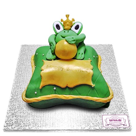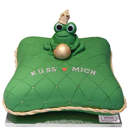 Das war wirklich eine witzige Idee für unsere Torte in Kissenform. Auf das Kissen haben wir einen süßen Frosch aus Fondant gesetzt, in den Händen hält er eine goldene Kugel, wie im Märchen. Auf dem grünen Kissen steht "Küss mich". Wer könnte diesem Frosch widerstehen? Mann könnte aber auch "Iss mich" draufschreiben, entpuppt sich das Kissen doch als ein lecker gefüllter Kuchen mit Fondant eingedeckt. Diese Torte passt wunderbar zu einem Kindergeburtstag unter einem Märchen-Motto, aber auch als Valentinstorte oder als Verlobungstorte. Wir empfehlen unsere Froschkönig-Torte auch gerne für Hochzeitsfeiern.