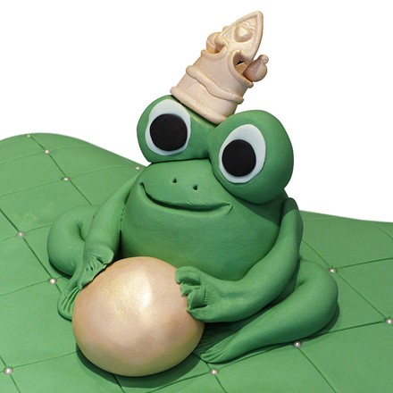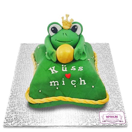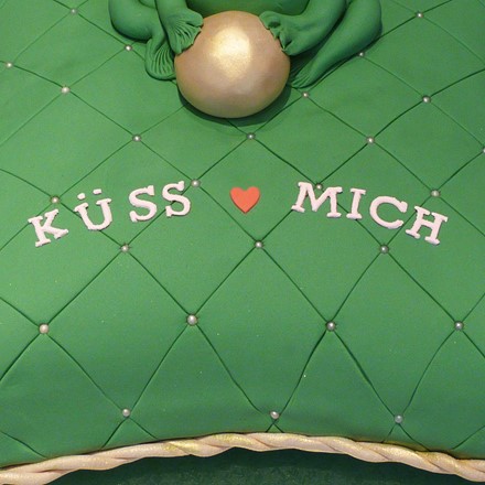 Eine sehr vielseitige Torte ist es, man kann sie zum Geburtstag bestellen, aber auch als Verlobungs- oder Hochzeitstorte macht sie eine gute Figur. Auf dem prachtvollen Kissen in sattem Grün sitzt ein lustiger Frosch aus Fondant. Die goldene Krone ist ihm etwas zu schwer und drückt auf ein Auge. Er freut sich aber trotzdem, hält er doch eine riesige goldene Kugel in seinen Händen. Aber am meisten freut er sich über die Aufschrift "Küss mich". Alle Dekorationen sind aus Fondant.» Zutaten + Zusatzstoffe