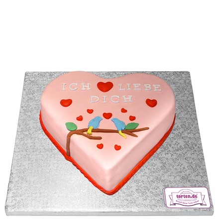 Wenn man an eine Torte denkt, mit deren Hilfe die wichtige Botschaft geschickt überbracht werden könnte, scheint ein Kuchen in Herzform besonders passend zu sein. Hier passt einfach alles: die Herzform, ein verliebtes, fröhlich zwitscherndes Vogelpaar, viele rote Herzen, die empor steigen, zum Himmer hinauf, und natürich die Botschaft selbst: Ich liebe dich.