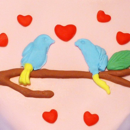 Unsere leckere Herztorte wird mit zart rosafarbenem Fondant überzogen. Ein offensichtlich verliebtes Vogelpaar zwitschert auf einem Ast. Alle Dekorationen sind aus Fondant. Eine individuelle Botschaft ist möglich (unter Zubehör bestellbar).