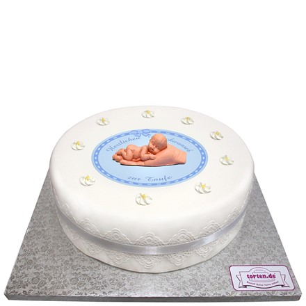 Zur Taufe eines Jungen muss man nicht immer auf das traditionelle Blaue ausweichen. Diese stilvolle Tauftorte mit einer Baby-Fondant-Figur sieht schlicht und elegant aus. Auf der Fondant-Karte steht unser Vorschlag für eine passende Gratulation: "Herzlichen Glückwunsch zur Taufe". Alle Dekorationen dieser Torte sind essbar (bis auf das Satinband, das vor dem Schneiden abgenommen werden muss). Die Baby-Figur kann als Andenken aufgehoben werden.