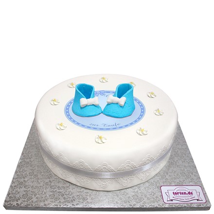 Zur Taufe eines Jungen muss man nicht immer auf das traditionelle Blaue ausweichen. Diese stilvolle Tauftorte mit Babyschuhen aus Fondant sieht schlicht und elegant aus. Auf der Fondant-Karte steht unser Vorschlag für eine passende Gratulation: "Herzlichen Glückwunsch zur Taufe". Alle Dekorationen dieser Torte sind essbar (bis auf das Satinband, das vor dem Schneiden abgenommen werden muss). Die Babyschuhen können als Andenken aufgehoben werden.