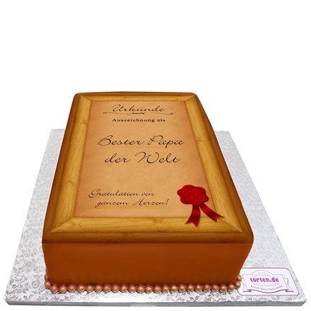 Diese Urkunden-Torte für den besten Papa eignet sich am besten zum Geburtstag oder Vatertag. Die Papa-Torte besticht durch das schlichte, aber sehr edle Design. Der Druck erfolgt mit Lebensmittelfarben, die Deko-Perlenkette ist auch essbar.
