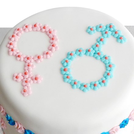 Ist das ein Mädchen oder ein Junge? Das ist die wichtigste Frage für die werdenden Eltern und ihre Freunde und Familie. Darum darf die Bekanntgabe des Baby-Geschlechts gefeiert werden! Unsere Boy or Girl Torte hat die doppelte Höhe, damit die farbige Füllung gut zur Geltung kommen kann. Geschmückt wird mit blauen und rosa Zuckerblümchen und einer Satinbandschleife ebenfalls in passenden Farben. Die Cremefüllung wird entweder blau oder rosa gefärbt. Für Zwillinge wird die Torte die beiden Farben enthüllen.