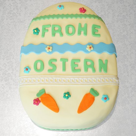 Eine Fondanttorte als Osterei gestaltet - dahinter steckt bestimmt der fleißige Osterhase! Die Torte wird aus einem rechteckigen Kuchen per Hand ausgeschnitten und mit der Wunschcreme gefüllt. Alle Dekorationen sind essbar.