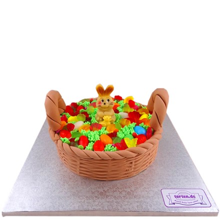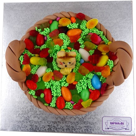 Torte zu Ostern soll bunt aussehen und kreativ sein. Unser Ostertortendesign verbindet mehrere osterliche Traditionen zu einem attraktiven Hingucker. Eine Torte wie ein Osterkorb verkleidet erinnert an die geflochtene Kiepe des traditionellen Osterhasen. Der Osterhase selbst darf natürlich auch nicht fehlen - hier sitzt er im Körbchen gefüllt mit Ostergras und süßen Leckereien.