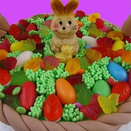 Eine Torte zu Ostern modelliert wie ein Osterkorb und dekoriert mit einer Osterhasen-Figur aus Marzipan und anderen hochwertigen Ostern-Leckereien. In dem handdekorierten Osternest ist unsere leckere Torte mit Creme gefüllt versteckt. Die Osterhasen Figur aus hochwertigem Marzipan und verschiedene Süßigkeiten krönen diese Ostern-Torte. Alle anderen Dekorationen sind aus Fondant handgefertigt. Die Henkel für den Oster-Korb werden mit Holzspießen versehen und separat eingepackt und dabei gelegt. Diese können ganz leicht in die Torte gesteckt werden.