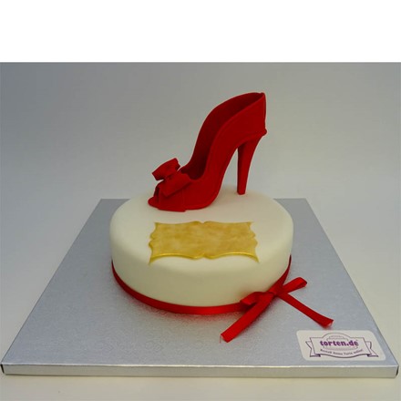 Eine elegante Motivtorte in rot-weiß mit einem High-Heel-Schuh aus Fondant passt zu vielen Anlässen, nicht nur zum Geburtstag. Auf dem Schild kann ein kurzer Gruß platziert werden. Das rote Satin-Band soll vor dem Schneiden abgenommen werden.Bitte wählen Sie eine Größe