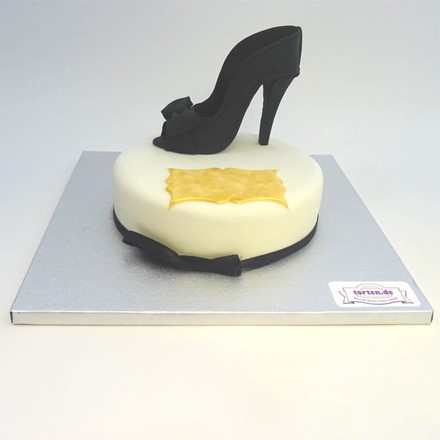 Ein handgemachter High-Heel-Damenschuh aus Zuckermasse schmückt diese elegante runde Torte. Stilvoll und verspielt zugleich wurde diese Torte nach Vorstellungen und Wünschen einer unseren Kundinnen gefertigt. Unserem Team gefiel das Ergebnis, und diese Fondanttorte mit Damenschuh nahm ihren Platz in unserer "Schuh-Torten Kollektion". Ein klassisches schwarzen Kleid, eine elegante schwarze Handtasche mit Glitzer, unverschämt hohe High Heels - unsere Tortenkreation passt wunderbar in dieses Bild. Die hübsche und leckere Schuhtorte gibt es in verschiedenen Größen, auch mehrstöckig.