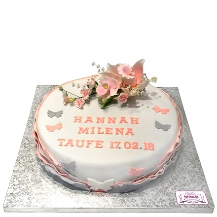 Diese Tauftorte ist nicht ganz klassisch, aber auf jeden Fall stilvoll und elegant. Kleine rosa und graue Schmetterlinge haben sich auf die weiße Torte gesetzt, als ob von der Orchidee angezogen. Der Tortenrand ist mit mehreren Rüschen aus rosa und grau gefärbtem Fondant drapiert.