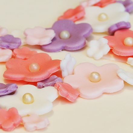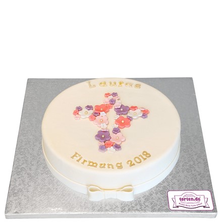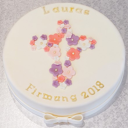 Schlicht und elegant, passt diese runde Torte wunderbar zu den kirchlichen Anlässen. Kleine zarte Blümchen in rosa und lila Tönen zieren die Firmungstorte. Der Tortenrand wird mit einem Band und einer Schleife aus Fondant dekoriert. Mit 2-D-Buchstaben wird die persönliche Widmung "geschrieben".