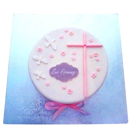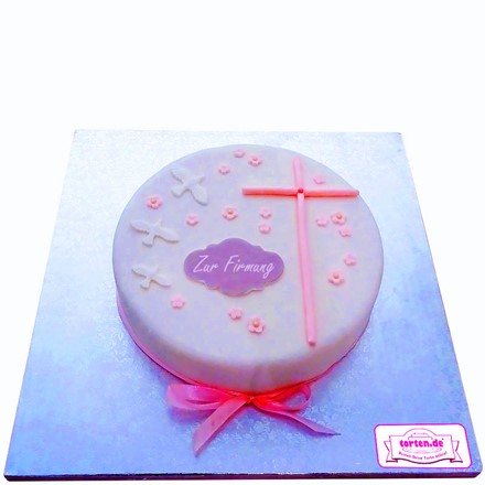 Unsere Torte für Firmung eines Mädchens ist klassisch und schlicht in 2 Farben gehalten. Mit einem Kreuz und Tauben aus Fondant wirkt unsere Tortenkreation edel und stilvoll. Eine rosa Satinschleife rundet diese feierliche Torte ab. Unsere Firmung Torte kann personalisiert werden: dazu gibt man den Namen des Kindes und eine persönliche Widmung im Bestellvorgang unter Zubehör ein. Alle Fondant-Dekorationen sind essbar. Die Satinschleife soll vor dem Schneiden abgenommen werden.