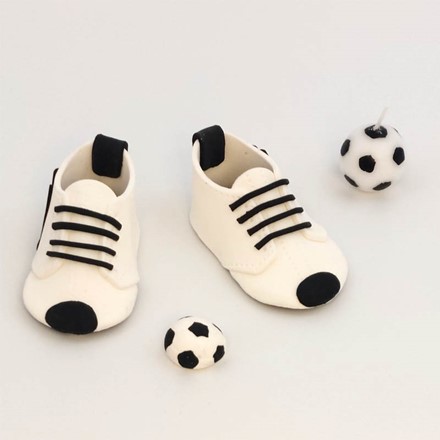 Der Set beinhaltet ein Paar Fußballschuhe und einen kleinen Fußball, die aus feiner Zuckermasse in Handarbeit hergestellt werden, und eine Fußballkerze, die nicht essbar ist.