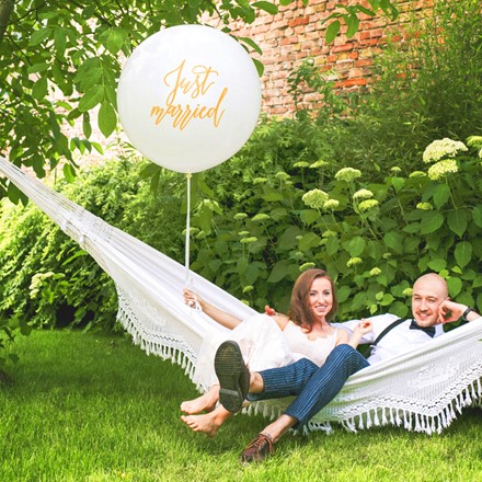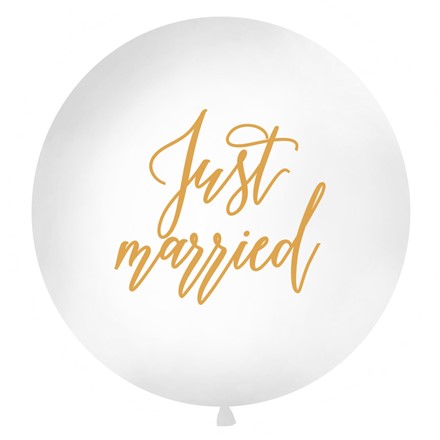 Mit so einem extra großen Luftballon kann man vieles auf einer Hochzeitsparty anstellen. Deiner Fantasie sind keine Grenzen gesetzt. Der Schriftzug in goldener trendiger Schrift lautet "Just married". Ein toller Hingucker auf jeder Hochzeitsparty.