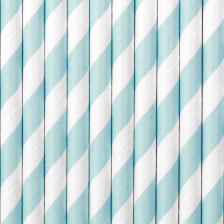 Hellblaue Papierstrohhalme mit weißen Diagonalstreifen. Länge ca. 19,5 cm. (1 Packung / 10 Stück)