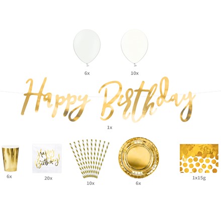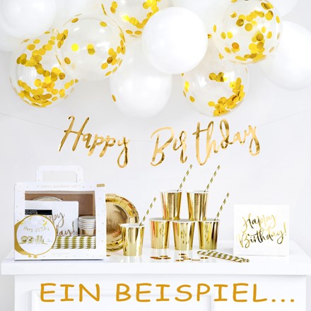 Geburtstagsdekorationen in goldenen Tönen. Das Set enthält: „Happy Birthday“-Banner (1 Stück), Pappbecher (6 Stück), Pappteller (6 Stück), Papierstrohhalme (10 Stück), Papierservietten (20 Stück), Konfetti (15 g) und Latexballons (Pastel Pure White 10 Stk. und Crystal Clear 6 Stk.).