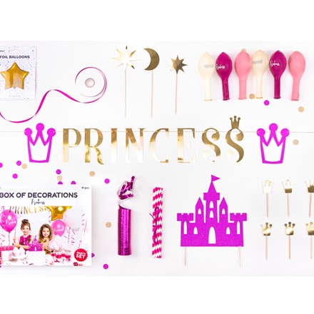 Partydekorationen Set Prinzessin beinhaltet: Princess-Girlande (1 Stk.), Muffin-Topper (6 Stk.), Torten Topper (4 Stk.), Strohhalme (10 Stk.), Luftballons (Designmix, 6 Stk.). ), Sternballon aus Goldfolie (1 Stück), Konfetti (2 g), dunkelrosa Luftschlange (1 Stück) und fuchsiafarbenes Satinband (6 mm breit, 1 Stück).