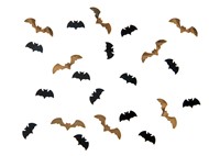 Fledermaus-Konfetti, schwarz und gold, Maße 1,7x0,7 Zentimeter, 2,5x0,7 Zentimeter.