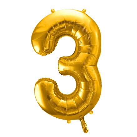 Folienballon Zahl 3 in metallic gold. Größe vor dem Aufblasen ca. 100 cm, Größe nach dem Aufblasen ca. 86 cm. Geeignet zum Aufblasen mit Luft und Helium.