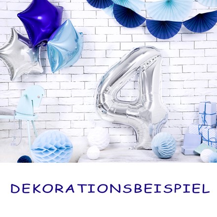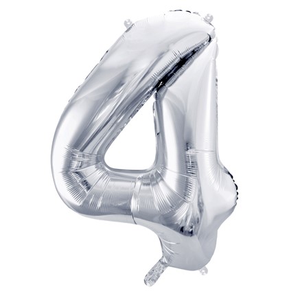 Folienballon Zahl 4 in metallic silber. Größe vor dem Aufblasen ca. 100 cm, Größe nach dem Aufblasen ca. 86 cm. Geeignet zum Aufblasen mit Luft und Helium.