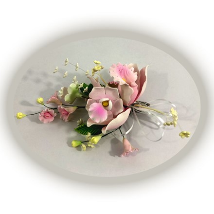 Tortendekoration aus Feinzucker zum Dekorieren von Torten. Dieses in Handarbeit gefertigte Blumenbouquet ist mit Blumendraht und Blumenbändern verbunden und ist nicht zum Verzehr geeignet.