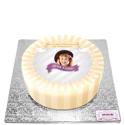 Eine Kommunion Torte kann man auch ganz individuell gestalten. In unserem Fototorten-Creator wird das eigene Foto hochgeladen und zurechtgeschnitten und -geschoben. Der schöne Rahmen und der Tortenrand kommen automatisch dazu. Ihr könnt noch eine zweizeilige persönliche Botschaft draufdrucken lassen, zum Beispiel den Namen und das Datum. Fertig ist die kreative und ganz eigene Torte zur 1. heiligen Kommunion.