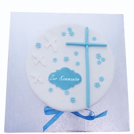 Eine weiße runde Torte mit einem Kreuz und Tauben aus Fondant. Eine Satinschleife rundet diese feierliche Torte perfekt ab. Sie kann auch individualisiert werden: dazu kann man den Namen des Kindes und eine persönliche Widmung im Bestellvorgang eingeben.