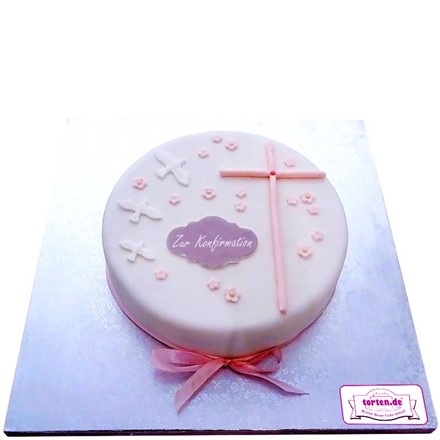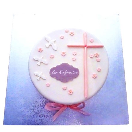 Diese elegante weiße Torte wird mit einem Kreuz und Tauben aus rosa und weißem Fondant und einer persönlichen Botschaft dekoriert. Am Rand wird diese Konfirmation Torte mit einer Satinschleife verziert. Eine individuelle Widmung macht diese Torte perfekt für die kirchliche Feier.